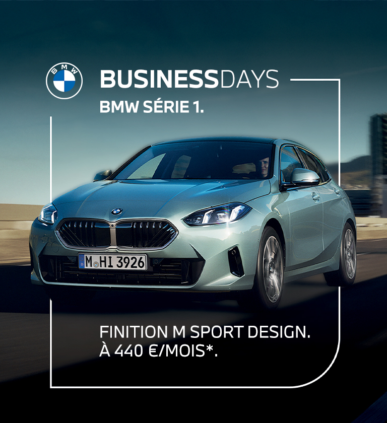 BMW SÉRIE 1 16 Finition M Sport Design 122 ch BVA7. 48 loyers linéaires : 441,35 €/mois hors coûts d’immatriculation. Location Longue Durée sur 48 mois et pour 60000 km incluant l’Entretien, l’Assistance 24h/24, la Garantie Perte Financière, deux pneumatiques et la tolérance sur les frais de remise en état de 1000€. Tarif sous réserve des modifications du tarif constructeur en vigueur, assurances ou variation des taux financiers et taxes. Montants TTC dont TVA 20 %. Offre réservée aux professionnels pour toute commande d’une BMW SÉRIE 1 16 Finition M Sport Design 122 ch BVA7 dans les concessions participantes avant le 31/12/2024 et sous réserve d’acceptation de votre dossier par Alphabet France Fleet Management SAS au capital de 6 295 380, 25 € – 5, rue des Hérons à Montigny-Le-Bretonneux, 78182 Saint-Quentin-en-Yvelines Cedex – RCS Versailles 338 708 076 – N° TVA Intracommunautaire FR 61 338 708 076 – N°ORIAS : 13009206 – Téléphone : 01.30.47.10.66. Prestation Entretien & Assistance souscrite auprès d’Alphabet. La Garantie Perte Financière est accordée selon les conditions prévues au contrat n°7.610.101 souscrit auprès de MMA IARD Assurances Mutuelles, société d’assurance mutuelle à cotisations fixes, siège social : 14 bd Marie et Alexandre Oyon, 72030 Le Mans Cedex 9, 775 652 126 RCS Le Mans, et MMA IARD, SA au capital de 537 052 368 €, siège social : 14 bd Marie et Alexandre Oyon, 72030 Le Mans Cedex 9, 440 048 882 RCS Le Mans, sociétés appartenant au groupe COVEA et régies par le Code des assurances. MMA et Alphabet sont soumis au contrôle de l’Autorité de Contrôle Prudentiel et de Résolution- 4 Place de Budapest CS 92459 75436 Paris Cedex 09. Le véhicule présenté comporte des équipements en option, le loyer ainsi que le détail des caractéristiques techniques du véhicule sont disponibles auprès d’Alphabet. Consommation mixte combinée : 5,9 – 6,3 l/100 km. CO2 combinée : 135 – 143 g/km – Norme WLTP. Depuis le 01/09/2018, les véhicules légers neufs sont réceptionnés en Europe sur la base de la procédure d’essai harmonisée pour les véhicules légers (WLTP), procédure d’essai permettant de mesurer la consommation de carburant et les émissions de CO₂, plus réaliste que la procédure NEDC précédemment utilisée.